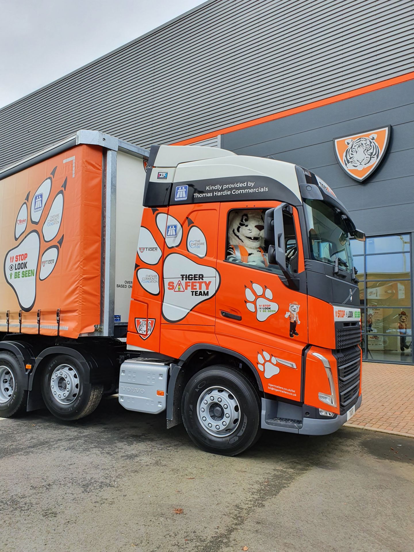 The 6x2 pusher axle tractor unit played a leading role during Tiger Safety Team's launch event held at Tiger Trailers' factory during Road Safety Week from a well-known charity, Brake. The truck's unmissable orange, white and black livery incorporates Tiger Safety Team's mascot, Tiger Ted, along with a large paw print containing the logos of the project's supporters – Brake, Cheshire Community Foundation, and Thomas Hardie Commercials Ltd.